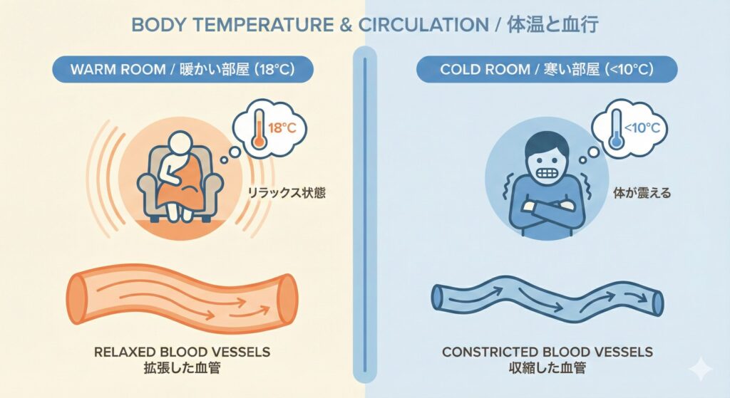 • 「外の寒さ」より「部屋の寒さ」が重要:外気温よりも、過ごしている室内温度が血圧に強く影響します。室温が1℃下がるごとに、高齢者では血圧が0.22mmHg上昇するという報告もあります 。