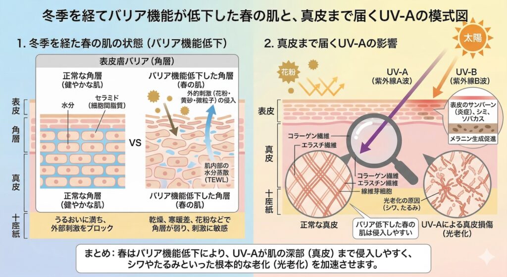しかし、気温が過ごしやすいために主観的な熱感や痛みが少なく、多くの方が本格的な紫外線対策を5月以降に先送りしてしまう傾向にあります 。さらに、冬季の低紫外線環境下でメラニンが減少し、バリア機能が低下した「無防備状態」の皮膚にとって、急増するUV-A(320-400nm)は真皮深層にまで到達し、蓄積的な光老化の決定的な要因となります 。