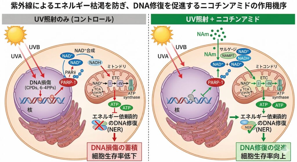 ニコチンアミドは、細胞内のエネルギー代謝に不可欠なNAD+の前駆体です。紫外線によるDNA損傷の修復には膨大なATP(細胞内エネルギー)が必要ですが、UV曝露はPARP(ポリADPリボースポリメラーゼ)を過剰活性化させ、NAD+を枯渇させて細胞を「エネルギー危機」に陥らせます 。