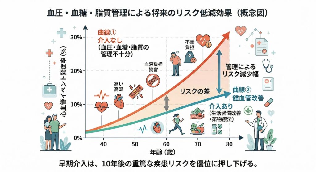A: 生活習慣病の多くは「サイレントキラー」と呼ばれ、症状が出た時にはすでに脳梗塞や腎不全などの不可逆的な障害が起きていることが多いのが実情です。 EBMの観点からは、数値の異常を「将来のリスクを買い取るための投資」と捉え、必要であれば早期から薬物療法を検討することが、長期的なコストパフォーマンス(医療費抑制や生活の質の維持)に優れていることが示唆されています。
